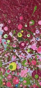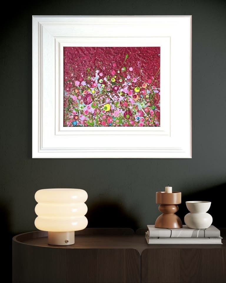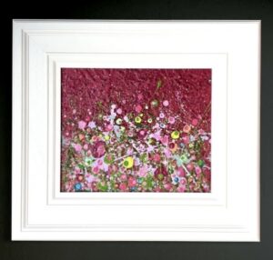 This rich beauty is filled with dainty buds and colourful peekaboo blooms . Crafted with acrylics and mixed media, she has depth, textures and will twinkle away with the evolving light. Professionally framed in a contemporary style and ready to hang. A striking original with card of authenticity. Post Countrywide : £15 or Studio Collection. Pop me a message for further details, photographs or to reserve this piece.x
