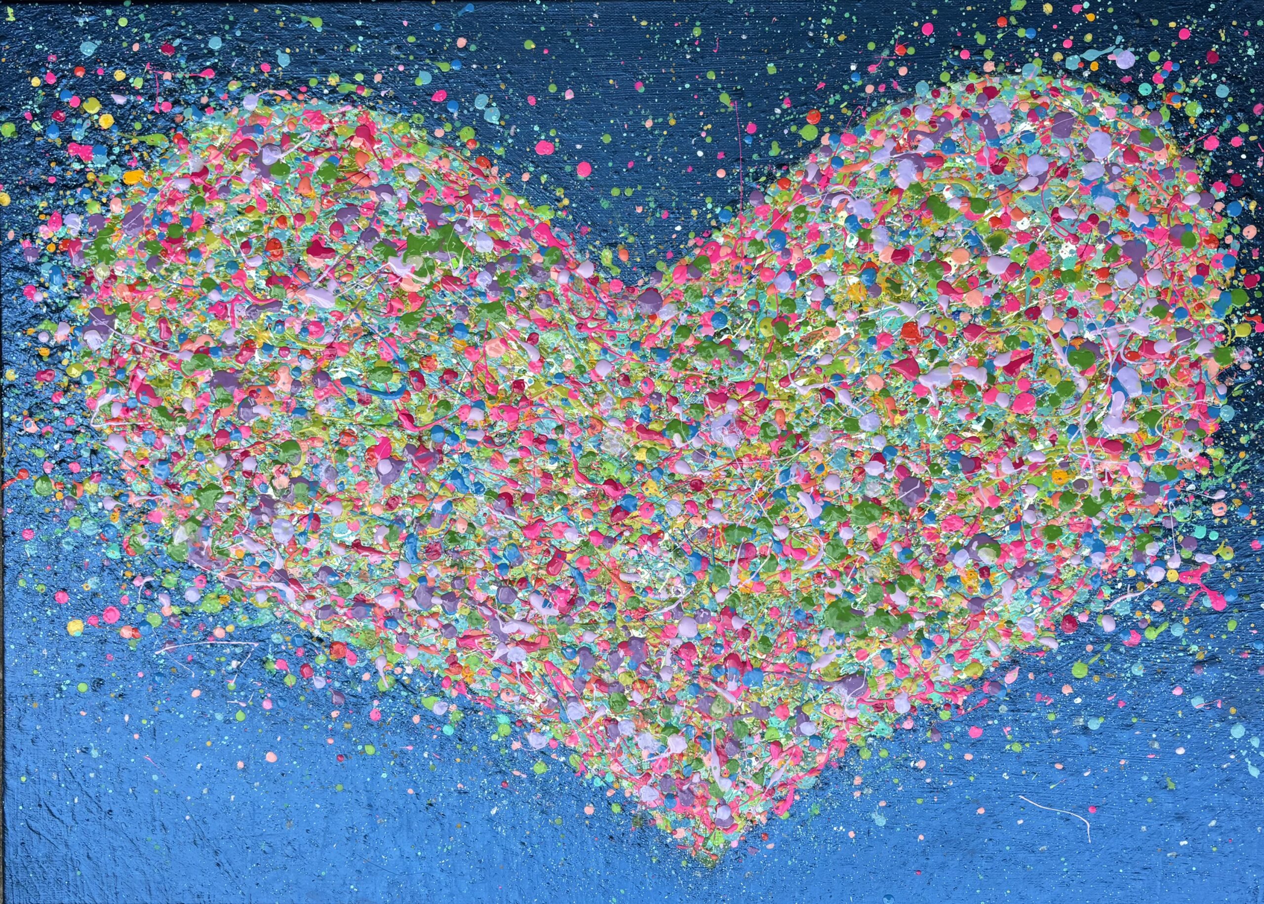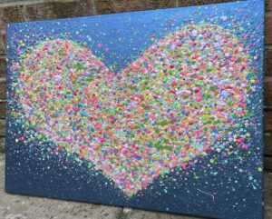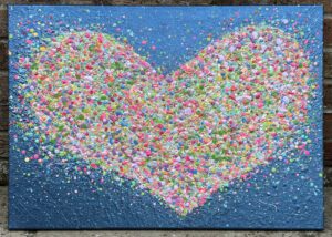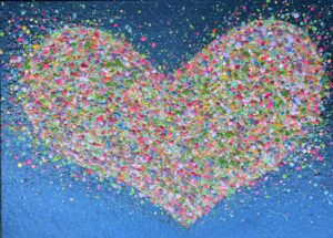 From my new Beautiful Hearts’ Collection, this piece is full of dainty shadowed textures on an iridescent blue with a complimenting mix of colours. This lady is adorned with cut diamond glass and sparkle, keeping the eye exploring as the light changes .