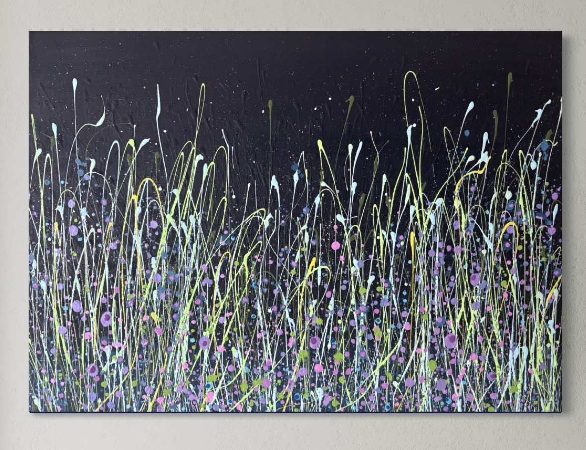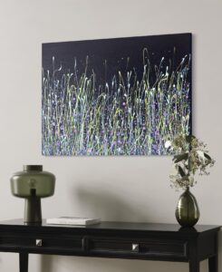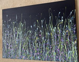 This canvas has layers and layers of colourful buds and blooms and really pops with the striking toned grass blades. This rich navy background is bursting with complimenting mixed peekaboo buds that really makes a statement. With twinkle and sparkle she will offer new delights with the changing light. Originals offer so much extra and can be so very tactile too. Post countrywide: £20 or studio collection. Created with love and a passion for colour and nature x . Do pop me an enquiry message below for further details or to reserve this illuminating lady. X